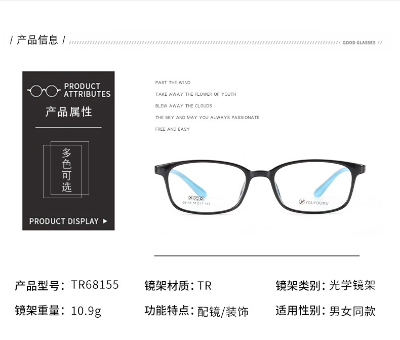 丹阳近视眼镜tr90批发68155男款中小号全框架眼镜 女超轻TR眼镜架